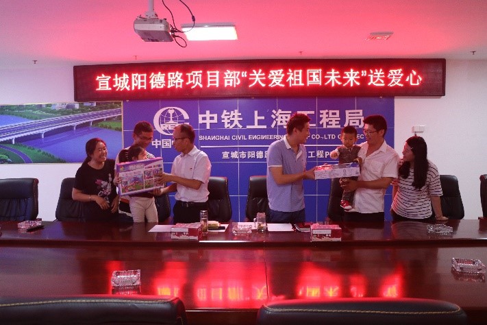 項目兩位女員工與丈夫不在一個項目部,獨自帶小孩工作生活,工程項目繁忙,家庭也不能團聚,為使員工子女過上一個有意義的兒童節,把項目“職工小家”建設工作落到實處,項目部特意為小朋友挑選適合的禮物。61日,項目黨支部書記賈述榮代表項目部向2名小朋友送去節日禮物,在為小朋友們送去祝福的同時,也向員工的辛勤工作表示了衷心感謝,并特意給她們放假半天,帶孩子走出項目部開展親子互動活動,項目青年員工與2名小朋友進行了互動游戲。