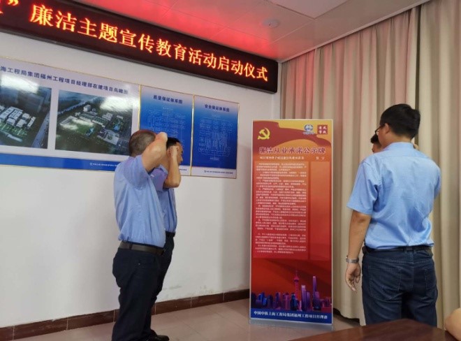 福州工程項(xiàng)目開展“清風(fēng)市政”廉潔主題宣傳教育活動(dòng)。6月7日下午,福州工程項(xiàng)目黨支部舉行第三屆企業(yè)文化節(jié)“清風(fēng)市政”廉潔主題宣傳教育活動(dòng)啟動(dòng)儀式。會(huì)上,項(xiàng)目黨支部書記劉進(jìn)春介紹了本項(xiàng)目的具體活動(dòng)實(shí)施方案和工作部署,并對項(xiàng)目全體員工進(jìn)行工作動(dòng)員和提出要求。隨后,項(xiàng)目職工集體現(xiàn)場觀看《忠廉愛國,十代將門》廉政文化教育片,以谷府折家“忠廉”家風(fēng)為榜樣,引導(dǎo)大家從自身做起,重視家風(fēng)建設(shè),樹立忠于國家、以廉為榮的價(jià)值觀。最后,項(xiàng)目領(lǐng)導(dǎo)班子成員進(jìn)行了廉潔從業(yè)公開承諾,并依次在承諾公示牌上進(jìn)行簽名,紛紛表示將自覺踐行廉潔從業(yè)承諾內(nèi)容,堅(jiān)持遵規(guī)守紀(jì)、廉潔從業(yè),為全體職工做好“忠廉”表率。(王迪)